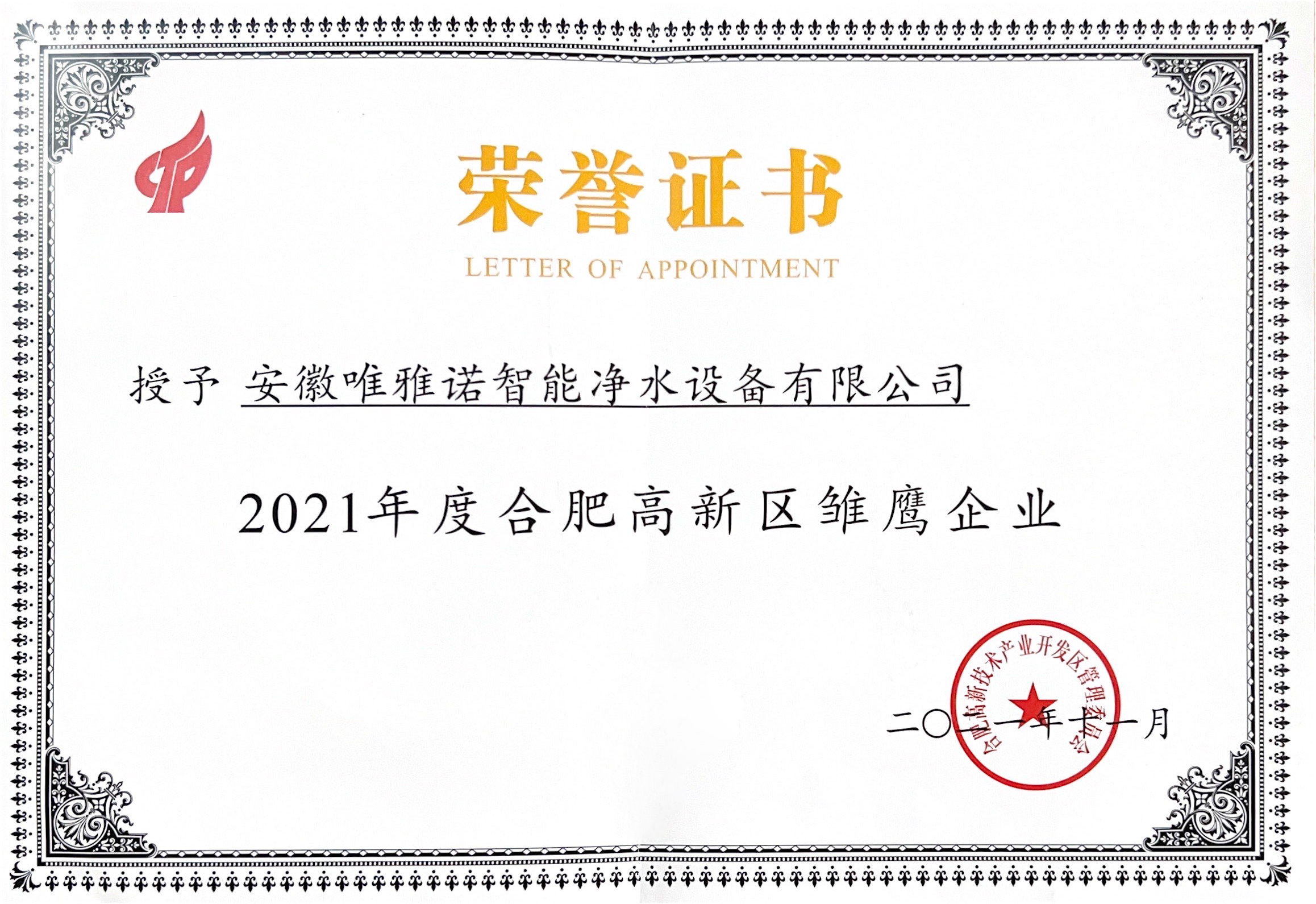 2021年,安徽唯雅諾智能凈水設(shè)備有限公司被認定為國家高新技術(shù)企業(yè)、合肥高新區(qū)雛鷹企業(yè)。