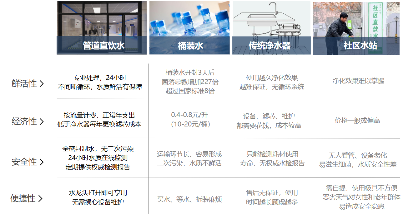 雖然目前管道直飲水還處于起步階段,但與包裝水、小區(qū)飲水站、家用凈水器等這些傳統(tǒng)的飲水方式相比,管道直飲水入戶(hù)有著明顯的優(yōu)勢(shì)。
