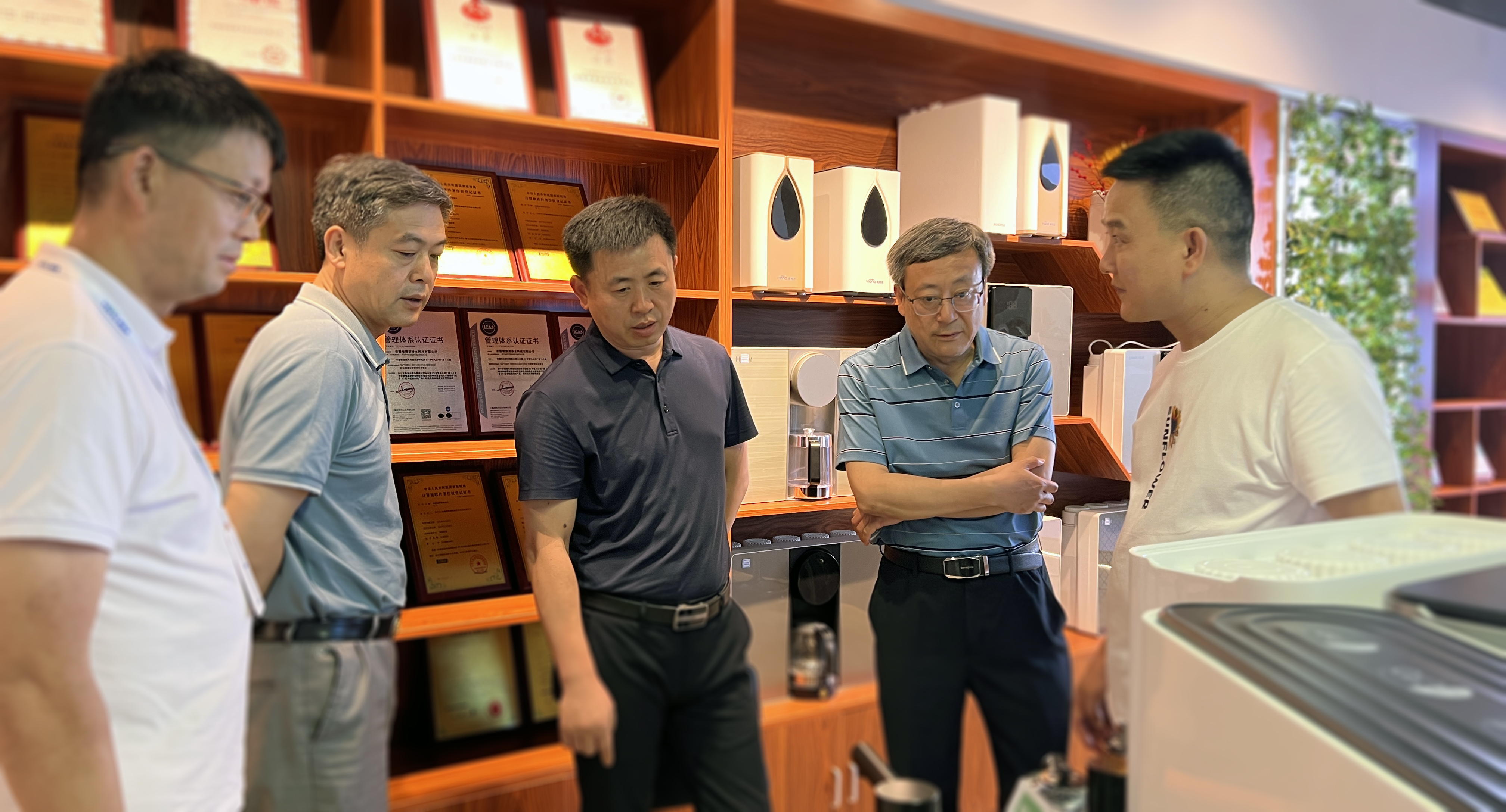 8月2日,安徽省經信廳二級巡視員查漢斌、消費品工業(yè)處處長吳合金、 消費品工業(yè)處三級調研員吳振文一行蒞臨安徽唯雅諾智能凈水設備有限公司調研指導并舉行座談會。唯雅諾董事長何中義、唯雅諾智能副總經理方理民等全程陪同接待。